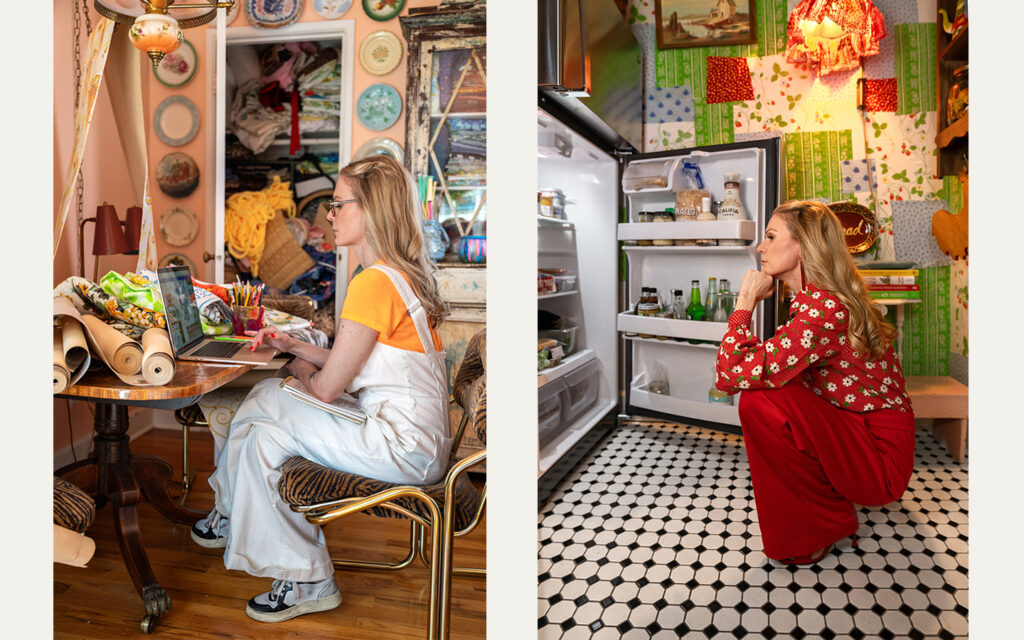 The image below is the workspace of an extremely creative and imaginative artist who works mostly with textiles. This capture of her in her element tells a true story of her process – which, I would argue, most people would find fascinating. She also has a quirky side and is not afraid to push boundaries, like in the second image. Her website and feed are a magical, whimsical rabbit hole that’s so fun to get lost in – and you definitely remember her.